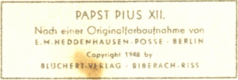 Text auf Rückseite PAPST PIUS XII. nach einer Originalfarbaufnahme von E. M. Heddenhausen-Posse, Berlin. Copyright 1948 von BLÜCHERT-VERLAG, BIBERACH Riß. Die 1948 datierte Postkarte kam spätestens im Januar 1949 in den Verkauf; am 8. Januar 1949 schickte Walter Blüchert ein Belegexemplar an den Bürgermeister von Biberach, welches dieser am 12. Januar verdankte. In seinem Begleitbrief an den Bürgermeister merkte Blüchert an, der Blüchert-Verlag hat (ergänze die Rechte für) den Verkauf des Kunstblattes für die ganze Welt. Am 16. Februar 1949 wurde der Druck in Artikeln der Schwäbischen Zeitung gewürdigt. In diesem Zusammenhang ist auch der soeben erschienene, hervorragend gelungene, Siebenfarbendruck der einzigen Farbaufnahme von Papst Pius XIII. zu erwähnen, die vom Atelier E. M. Heddenhausen/Posse im Vatikan gemacht worden ist. Am 31. März 1949 stand in derselben Zeitung 'Neueste Farbaufnahme des Papstes'. Der Biberacher Verlag Walter Blüchert bringt eine ausgezeichnete Farbaufnahme des derzeitigen Heiligen Vaters, Papst Pius des XII. heraus, die von der ebenfalls hier ansässigen Berliner Meisterfotografin (sic) Frau Heddenhausen im Vatikan gemacht worden ist. Der Siebenfarbendruck stellt die erste Farbaufnahme des Heiligen Vaters dar, die nach dem Urteil eingeweihter Kenner das beste Portrait des Papstes überhaupt sein dürfte. Frau E. M. Heddenhausen-Posse hat sich schon früher mit ihren ausgezeichneten Farbporträts (sic) führender Persönlichkeiten einen internationalen Namen gemacht.